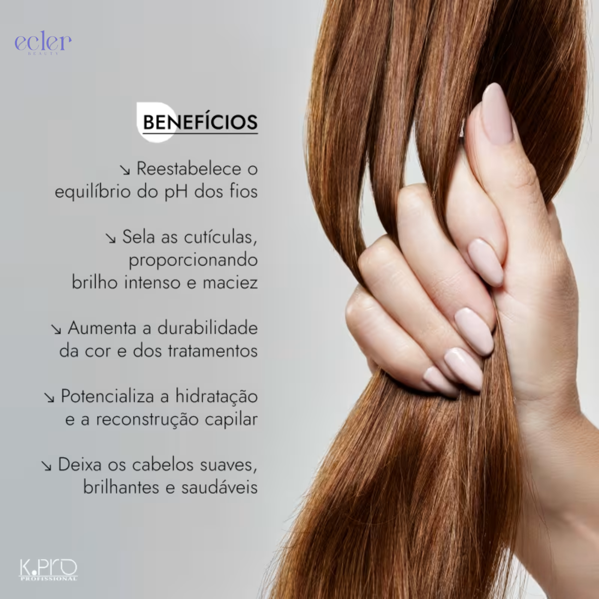 Potencialização de outros tratamentos: O acidificante prepara os fios para absorver melhor os ativos de máscaras e condicionadores, aumentando a eficácia de toda a rotina capilar. kpro.com.br